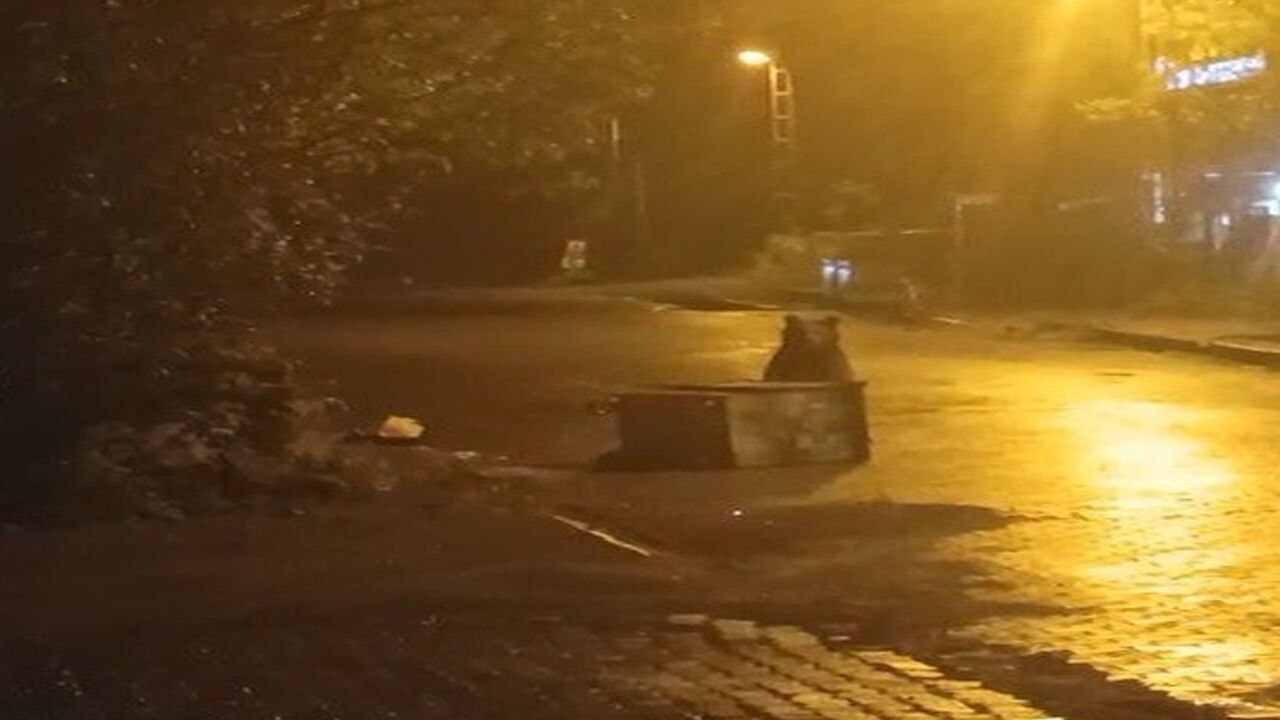Bir vatandaşın cep telefonu kamerasıyla kayıt ettiği görüntülerde, İlçe merkezine kadar inerek çöp konteynerini devirerek yiyecek arayan ayı daha sonra ormanlık alana girerek gözden kayboldu.
