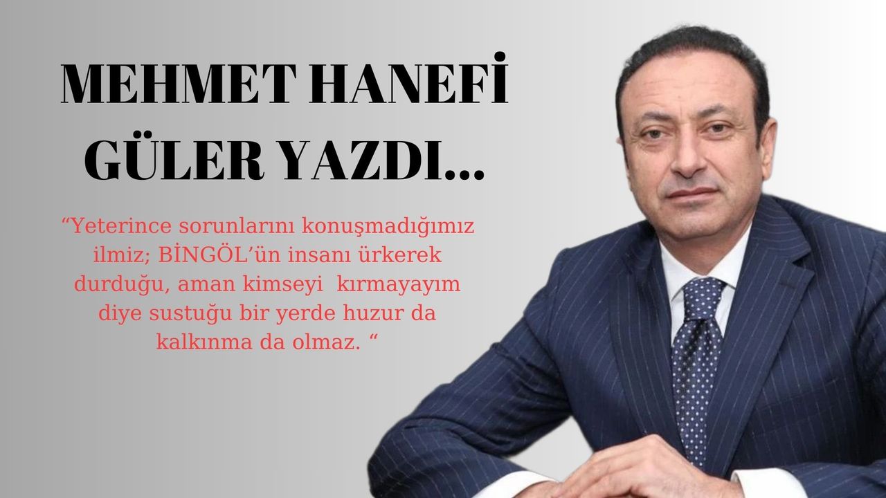 2018-2020 yılları arasında AK Parti Bingöl İl Başkanlığı görevini yürüten Mehmet Hanefi Güler, Bingöl’ün sosyo-ekonomik ve siyasal yapısına dair yazı kaleme aldı. Güler, ilde yeterince konuşulmayan sorunlara vurgu yaparak, suskun bir toplumun ne huzura ne de kalkınmaya ulaşabileceğini belirtti.