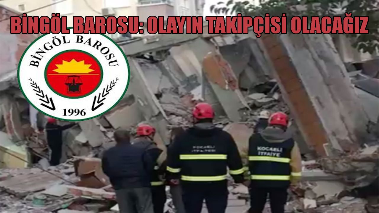 Bingöl Barosu, Kocaeli’nin Gebze ilçesinde bir binanın çökmesi sonucu Bingöllü aileden 4 kişinin yaşamını yitirdiği elim olayın tüm yönleriyle araştırılarak sorumlularının adalet önüne çıkarılması ve benzer acıların bir daha yaşanmaması için konunun takipçisi olacağını açıkladı.