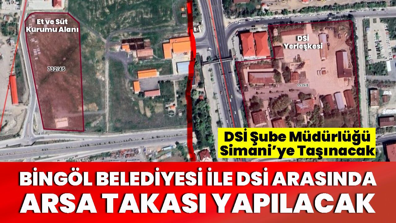 Bingöl Belediyesi ile Devlet Su İşlerine (DSİ) arasında yapılması planlanan arsa takası ile ilgili süreç başladı. Planlanan çalışmalar kapsamında Bingöl Belediyesi, 126 milyon 100 bin TL’ye Et ve Süt Kurumu Genel Müdürlüğünden satın aldığı 39 dönümlük arsayı, DSİ’ye devredecek. Bunun karşılığında ise DSİ’nin Düzağaç bölgesindeki yerleşkesi Bingöl Belediyesine devredilecek.