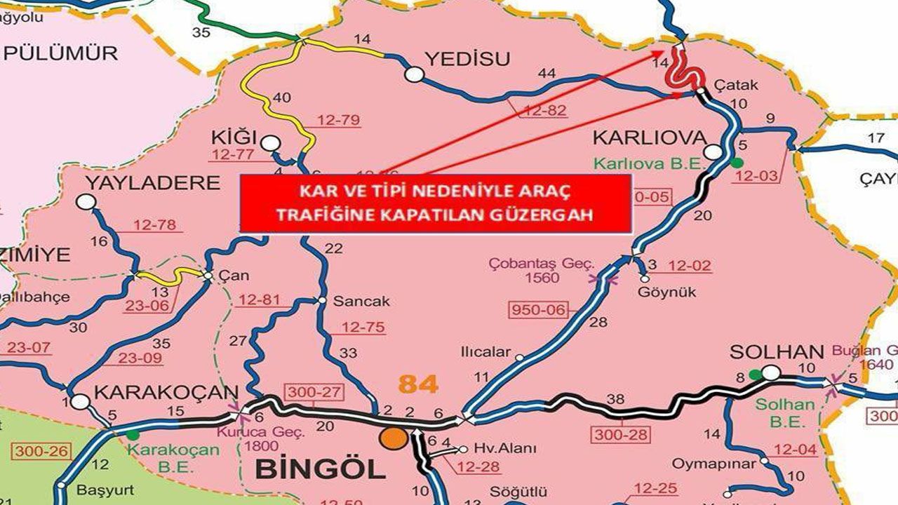 Valilik'ten yapılan açıklamada, "Bingöl-Erzurum karayolunun 0-14 km'leri arası yoğun kar yağışı ve tipi nedeni ile saat 17:00 itibari ile TIR trafiğine kapatılmıştır" denildi.