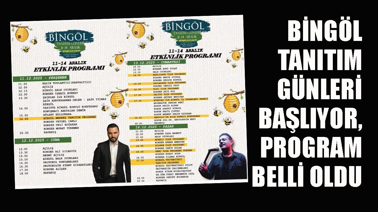 Program, 11 Aralık Perşembe günü saat 12.00’da start alacak. Halk oyunları gösterisinin ardından İsmail Burkay konser verecek. Abdurrahman Delen ve Yılmaz Bingöl’ün şiir dinletisinin ardından tarih araştırmacısı Abdullah Demir ‘Tarihte Bingöl’ konulu konferans verecek.