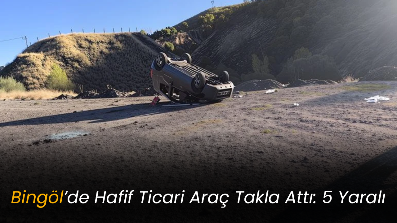Bingöl merkezine bağlı Elmalı köyü mevkiinde hafif ticari aracın takla atması sonucu 5 kişi yaralandı. Edinilen bilgilere göre, sürücüsünün direksiyon hâkimiyetini kaybettiği araç kontrolden çıkarak takla attı. Kazada araçta bulunan 5 kişi yaralandı. İhbar üzerine olay yerine sağlık ve UMKE ekipleri sevk edildi.