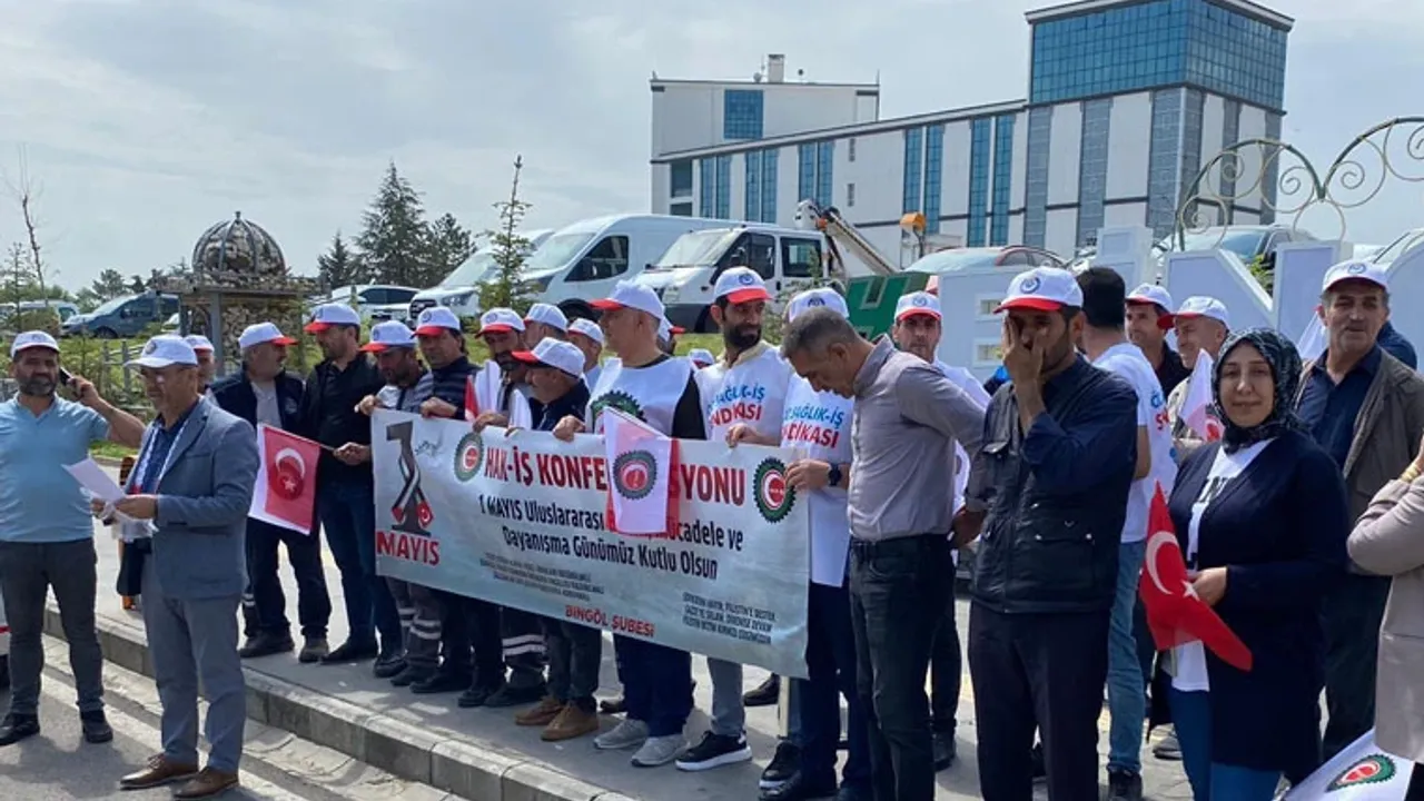 Hak-İş Konfederasyonu ve Hizmet İş Sendikası Bingöl Şube Başkanlığı tarafından 1 Mayıs Emek ve Dayanışma Günü münasebetiyle Genç Caddesi üzerinde Tekekom Kavşağı'nda basın açıklaması yapıldı. İşçilerin pankartlarla destek verdiği açıklamayı grup adına okuyan Hak-İş Konfederasyonu Bingöl İl Başkanı ve Hizmet İş Sendikası Bingöl Şube Başkanı Abdulmecit Akdemir, emekçilerin uluslararası birlik, mücadele ve dayanışma gününü kutladı. Akdemir, 1 Mayıs Emek ve Dayanışma günü vesilesiyle vergide adaletin sağlanması, enflasyon, hayat pahalılığı ve yoksulluk ile mücadele edilmesi, iş kazaları ve meslek hastalıklarının önlenmesi, kayıt dışı istihdamın ve sosyal güvencesizliğin önlenmesi, işsizlik, yoksulluk ve iş bulamama endişesinin olmadığı bir yaşamın sağlanması, emeklilerin asgari geçim şartlarının sağlanması, kadın, genç ve engellilerin çalışma ve toplumsal hayata katılımlarının desteklenmesi başta olmak üzere talep ve sorunlarını dile getirdi.
