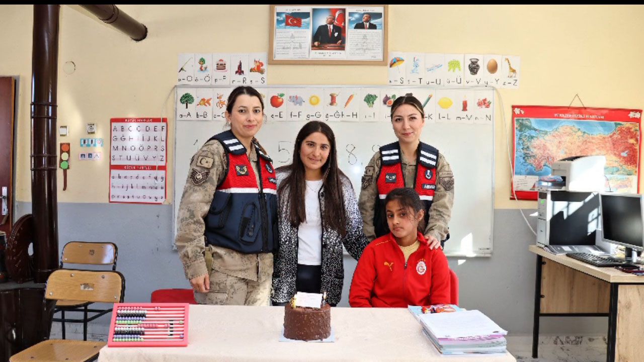 heyet, Kiğı ilçesindeki Alagöz İlkokulu’nda tek öğrenciye eğitim veren öğretmen ziyaret edildi. Jandarma personelinin anlamlı ziyaretinde, tek öğrencisine eğitim veren öğretmene yaş pasta kesilerek