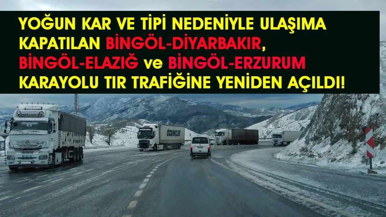 Bingöl'de etkili olan yoğun kar yağışı ve tipi dolayısıyla dün akşam saatleri itibariyle tır trafiğine kapatılan Bingöl-Diyarbakır, Bingöl-Elazığ ve Bingöl-Erzurum karayolu bugün öğle saatleri itibariyle yeniden ulaşıma açıldı.