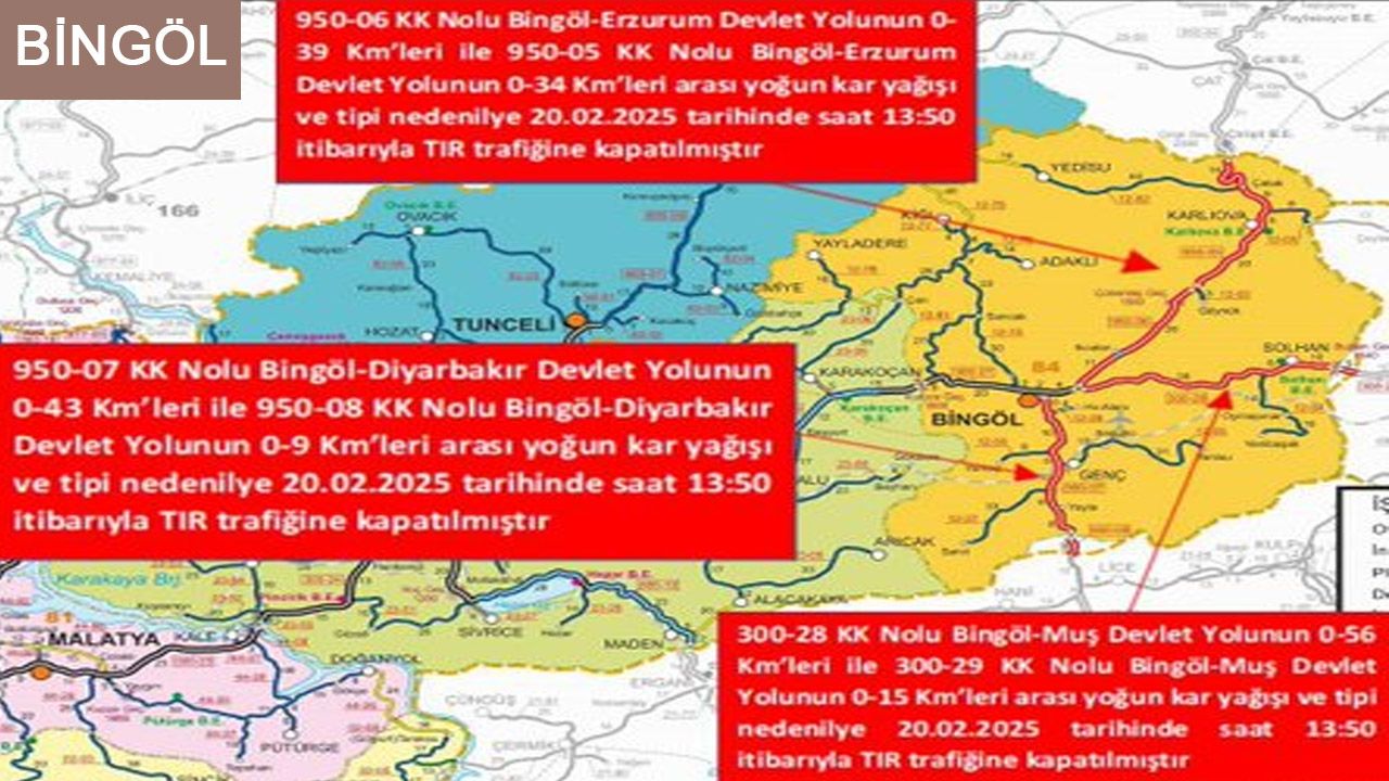 Bingöl Valiliği'nden yapılan açıklamada, Bingöl Erzurum karayolunun 0-34 ile 0-39 kilometreleri, Bingöl Diyarbakır karayolunun 0-43 ile 0-9 kilometreleri ile Bingöl Muş karayolunun 0-56 ile 0-15 kilometreleri arasının yoğun kar yağışı ve tipi nedeniyle bugün saat 13.50 itibariyle tır trafiğine kapatıldığını duyurdu.