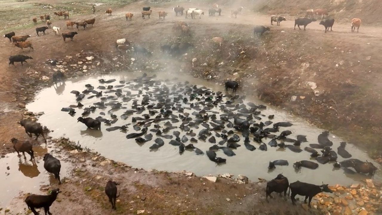 Manda sürüsünün, Budaklı Köyü sınırlarındaki termal su kaynaklarında temizlendiği anlar, dronla görüntülenirken, bölgedeki vatandaşlar sürüler halindeki mandaların 40 derece sıcaklıktaki kaplıca suyunda temizliğini yapıyor.