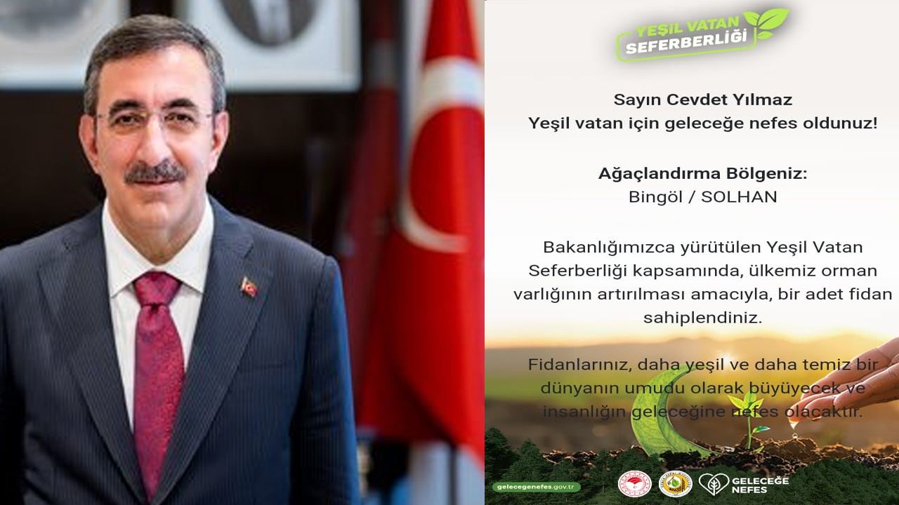 Cumhurbaşkanı Yardımcısı Cevdet Yılmaz, 11 Kasım Milli Ağaçlandırma Günü kapsamında başlatılan Yeşil Vatan Seferberliği münasebetiyle memleketi Bingöl'den fidan sahiplendi.