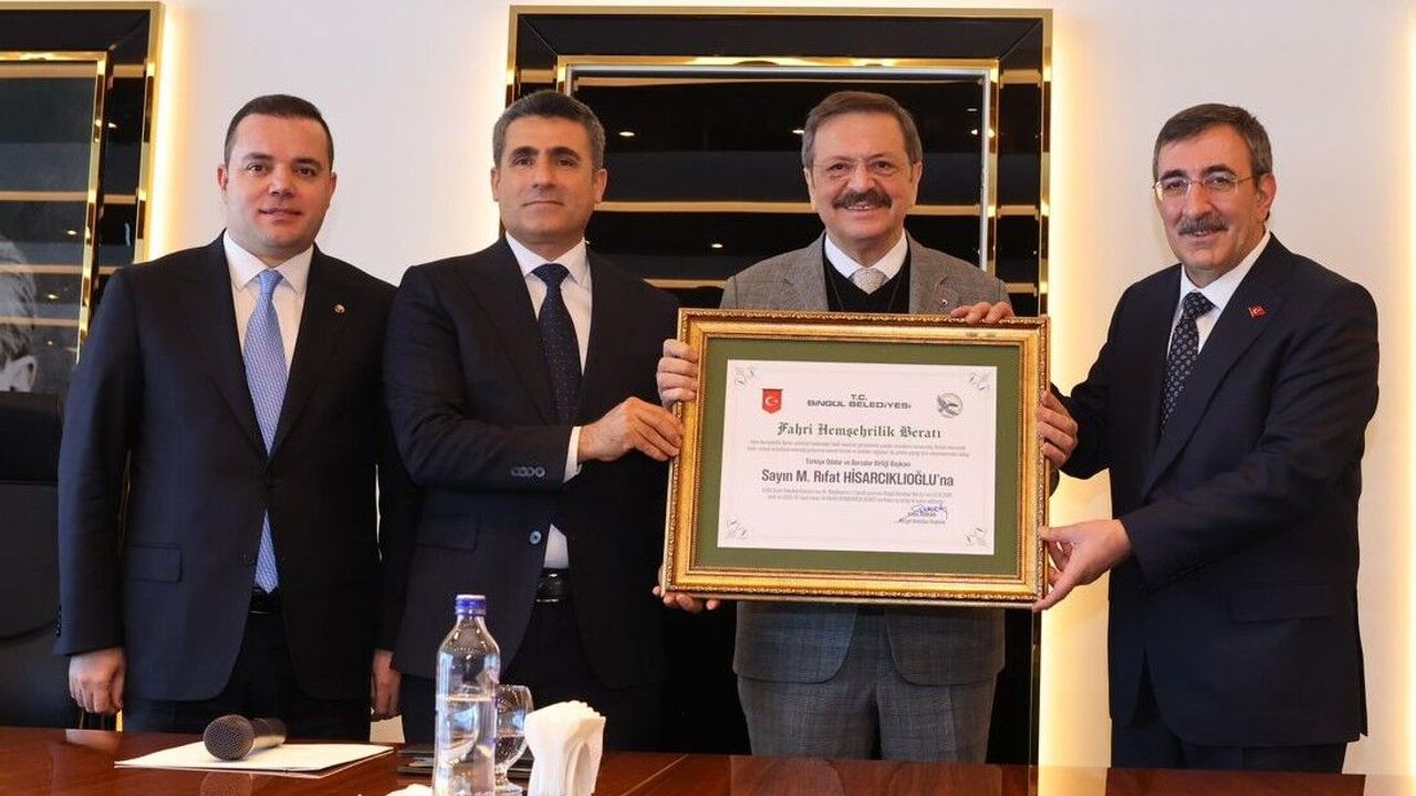 Bingöl’e bir dizi temaslarda bulunmak üzere gelen Cumhurbaşkanı Yardımcısı Cevdet Yılmaz, Bingöl Belediyesi Meclis Salonu’nda düzenlenen törende, Bingöl’de 2003 Depremi sonrası 480 kalıcı konut, 2015 yılında TOBB Cevdet Yılmaz Ortaokulu ile 2024 yılında Sanayi Sitesi’nde yapımı tamamlanan Hisarcıklıoğlu Bingöl Camii’ni hizmete sunulmasında ve BİNTSO yeni hizmet binasının yapımındaki desteğinden dolayı Türkiye Odalar ve Borsalar Birliği Başkanı Rifat Hisarcıklıoğlu’na ‘Fahri Hemşehrilik Payesi ve Beratı’nı takdim etti.