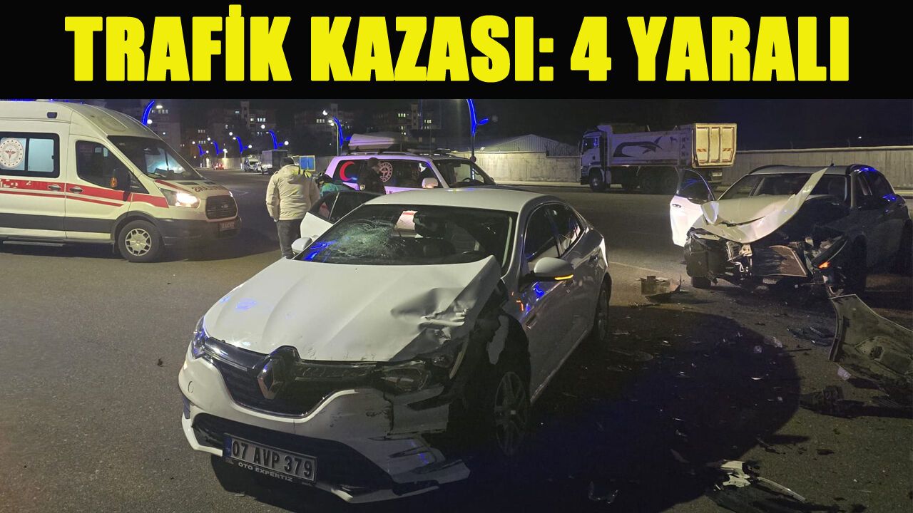 Alınan bilgiye göre, kent merkezi Diş Hastanesi ile Belediye yol ayrımı mevkiinde dün akşam saatlerinde meydana gelen trafik kazasında, 34 GJN 392 plakalı otomobil le 07 AVP 379 plakalı otomobilin çarpışması sonucu 4 kişi yaralandı. Çevredekilerin ihbarı üzerine