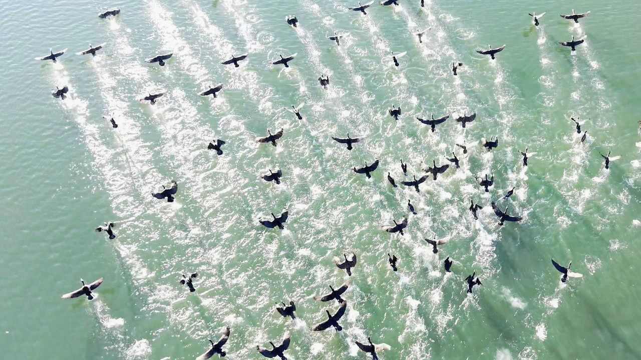 Elazığ'da etkisini sürdüren kar yağışı ve soğuk hava ile birlikte kent genelinde kış manzaraları oluşurken, Cip Barajı gölündeki karabatakların dronla kaydedilen görüntüleri, yaban hayatına dair eşsiz kış manzaraları oluşturdu. Gölün yüzeyinde bir süre koşarak ilerleyen karabatakların daha sonra kanat çırparak havalandığı görüntüler, dronla kaydedildi.
