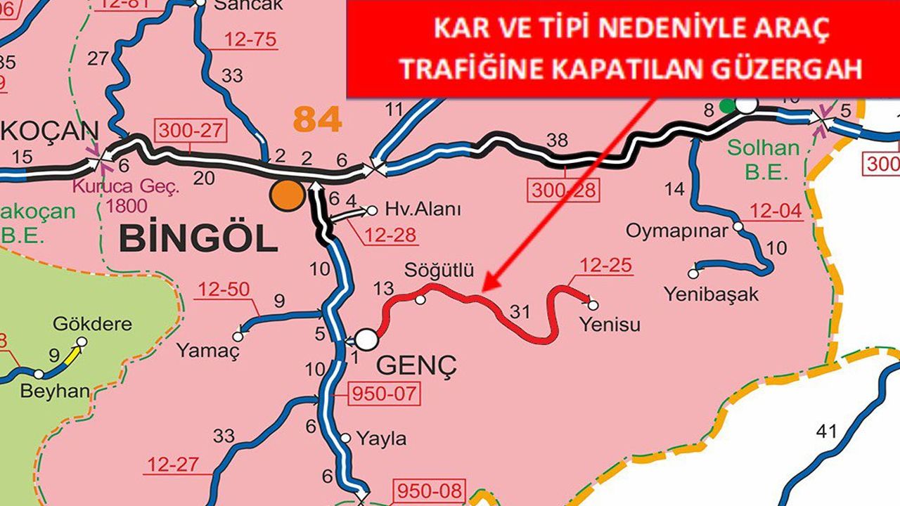 Valilik'ten konu ile ilgili olarak yapılan paylaşımda "Sürücülerimizin Dikkatine Genç-Yenisu İl Yolunun 0 ile 44 km’leri arası yoğun kar yağışı ve tipi nedeniyle saat 12.40 itibarıyla araç trafiğine kapatılmıştır" denildi.