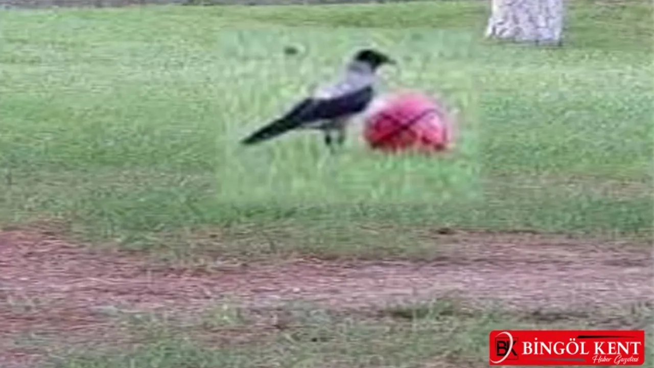 Elazığ’da bir karganın futbol topuyla oynaması görenleri şaşırtırken, o anlar cep telefonu kamerasına yansıdı.