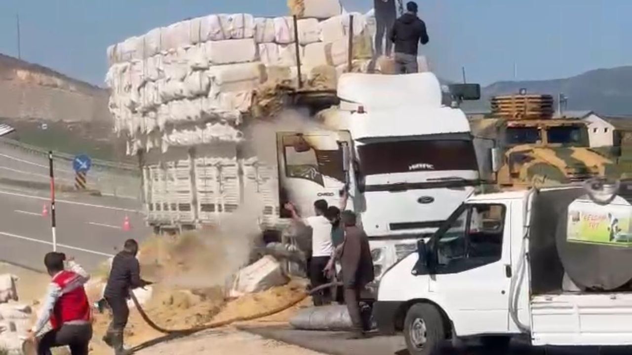 Saman yüklü kamyonda çıkan yangın, Karlıova Belediyesi İtfaiye ekiplerinin müdahalesiyle kontrol altına alındı.