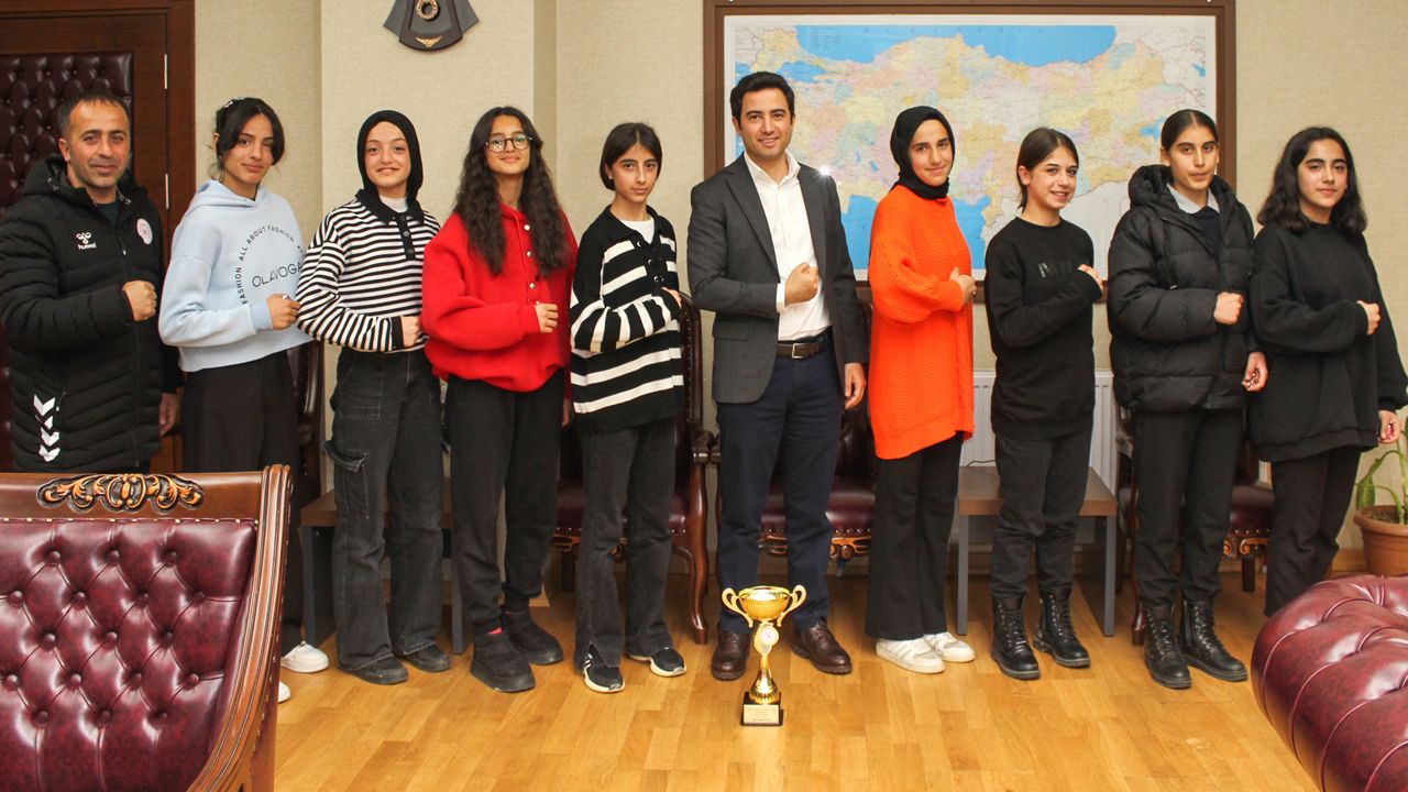 Mardin'de düzenlenen Kros Grup Müsabakaları'nda takım halinde 'birinci' olarak önemli bir başarıya imza atan Mevlana Ortaokulu ile bireyselde dereceye giren Şehit Mehmet Koçdağı Anadolu Lisesi sporcularını makamında ağırlayan Genç Kaymakamı Muhammet Güzel, elde ettikleri derecelerden ötürü öğrencileri tebrik ederek başarılarının devamını diledi.