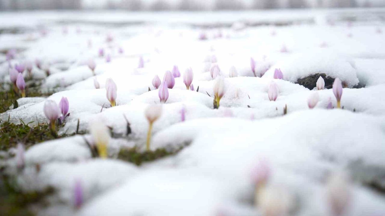 Donatım köyü çevresindeki arazilerde mor ve sarı renkleriyle doğayı süsleyen çiğdemler, hava sıcaklığındaki ani düşüşün ardından yağan karla kaplandı. Kış ile baharın aynı anda yaşandığı bölgede oluşan görüntüler dikkat çekti.