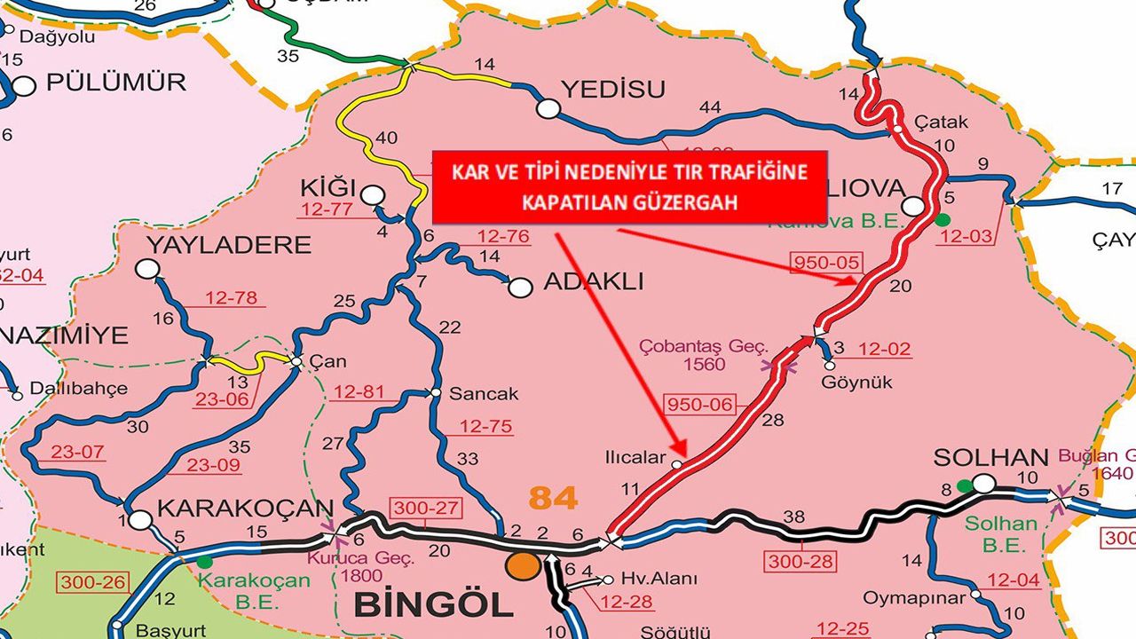 Bingöl Valiliği'nden yapılan paylaşımda, "Sürücülerimizin dikkatine! Bingöl-Erzurum Devlet Yolunun 0-88 kilometreleri arası (Kervansaray kavşağı ile Bingöl-Erzurum İl sınırı arası) yoğun kar yağışı ve tipi nedeniyle saat 16.50 itibariyle TIR trafiğine kapatılmıştır. Karlıova-Kargapazarı İl Yolunun 0-9 kilometreleri arası yoğun kar yağışı ve tipi nedeniyle saat 16.35 itibariyle TIR trafiğine kapatılmıştır.