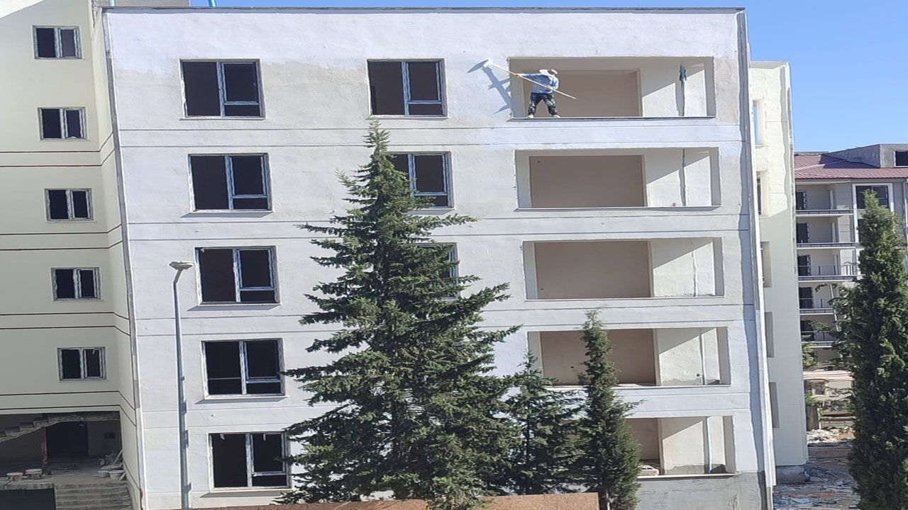 İnşaat halindeki 5 katlı binanın en üst katında hiçbir güvenlik önlemi almadan ve ekipman kullanmadan dış cephe boyası yapan işçi, olası bir kazaya davetiye çıkararak yürekleri ağza getirdi.