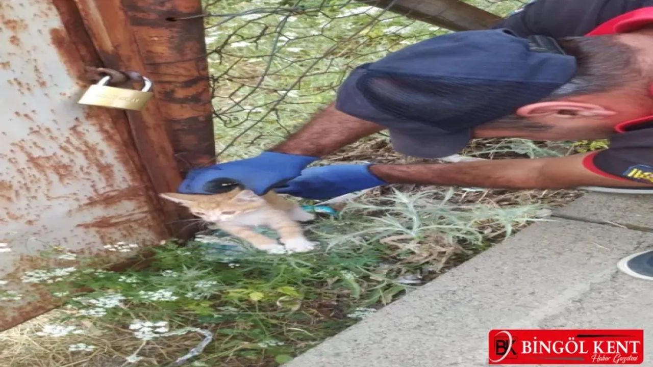 Bingöl’de bir bahçenin tellerine sıkışan yavru kediyi, itfaiye ekipleri kurtardı.