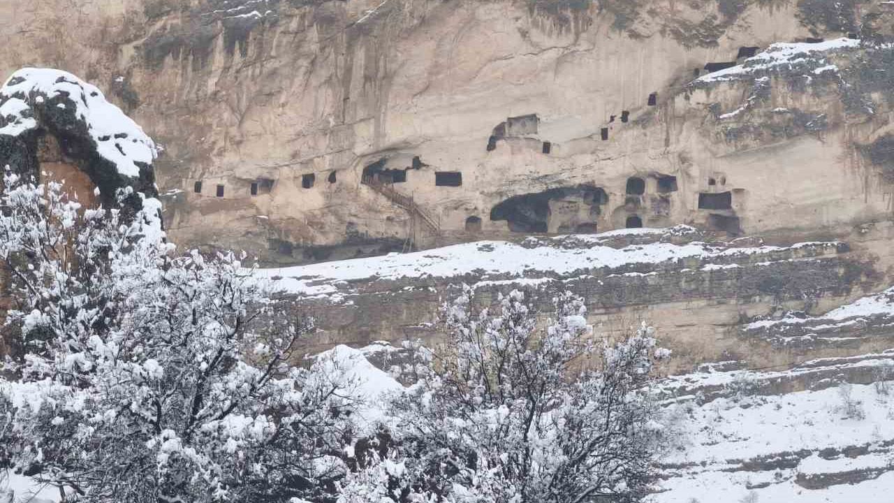 Tunceli’de kar yağışı sonrasında Urartu medeniyetinden kalma tarihi mağaralarda kartpostallık manzaralar oluştu.