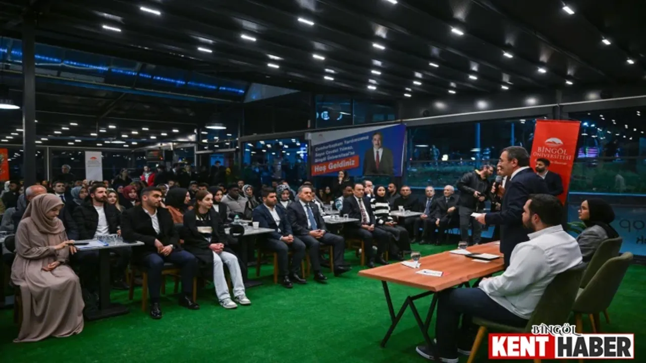 Bingöl Üniversitesi Merkezi Kafeteryada düzenlenen “Gençlik Buluşmaları” programında konuşan Cumhurbaşkanı Yardımcısı Cevdet Yılmaz, Bingöl Üniversitesi öğrencileriyle buluşmaktan mutluluk duyduğunu söyledi. Yılmaz, “Ramazan ayının bu güzel akşamında bizleri bir araya getiren Rabbimize şükürler olsun. Bingöl Üniversitesi göğsümüzü kabartan örnek bir üniversite. 20 bine yakın öğrenci, bin 500’e yakın personeli var. Kütüphanesi, sosyal alanı, sportif alanları, bilimsel başarısı, kültürel ve entelektüel çalışmaları ile üniversitemiz kendini ispatlamış durumda. Bugün uluslararası organizasyonlar yapan, yine uluslararası geçerliliği olan birtakım sıralamalarda yıllar önce kurulmuş üniversitelerden daha öne çıkmış bir üniversite. Bingöl Üniversitemizle her ortamda gurur duyuyoruz. Huzurunuzda rektör hocamızın şahsına gerçekten şükranlarımı sunuyorum” dedi.