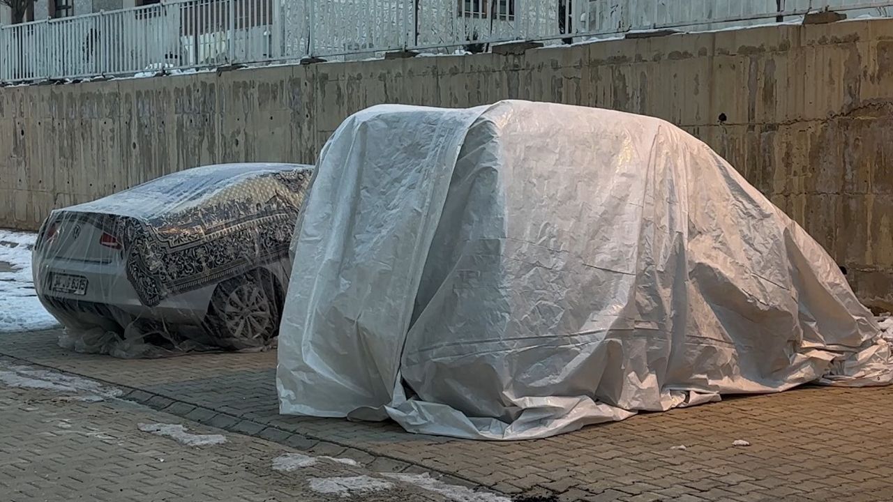 Hakkari’nin Yüksekova ilçesinde dondurucu soğuklar etkisini sürdürürken, araçların donmasını önlemek için vatandaşlar battaniye ve branda kullanarak çözüm bulmaya çalışıyor.
