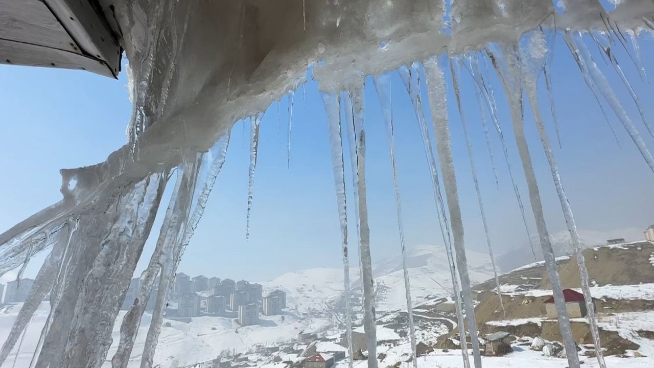 Hakkari’nin Yüksekova ilçesinde etkili olan soğuk hava ile birlikte binaların çatılarında oluşan buz sarkıtlarının boyu 2 metreyi geçti.